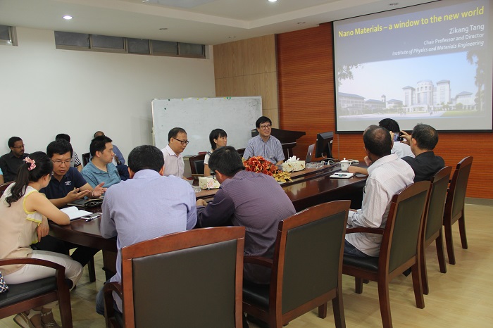 9月22日上午,我校江苏省新型环保重点实验室举办学术报告会,澳门大学汤子康教授应邀作题为“Nano Materials- A Window to the New World”的报告。重点实验室常务副主任侯贵华教授主持,重点实验室及相关学院师生参加。 汤子康教授介绍了他们研究团队在纳米结构氧化锌半导体薄膜室温紫外激光发射、世界上直径最小(0.4 nm)单壁碳纳米管及其一维超导特性研究等方面取得的重要成果,并介绍了澳门大学应用物理和材料工程研究所目前的主要研究方向。报告会后,汤子康教授与重点实验室教师就开展合作研究进行了讨论。 汤子康,澳门大学教授,应用物理和材料工程研究所所长,国际知名纳米光电子材料领域领军人物。中山大学长江学者讲座教授、国家杰出青年基金获得者。主要从事纳米材料的制备及其光电特性的研究,首次从实验上发现了量子尺寸效应作用下激子须遵循的光跃迁选择新定则,以及激子光跃迁振子强度与纳米尺度的依赖关系。在包括Nature、Science、Physical Review Letters、Advanced Materials、JACS、PNAS等世界顶级学术期刊上发表研究论文200余篇,被引用超过12000次,国际会议邀请报告80多次。