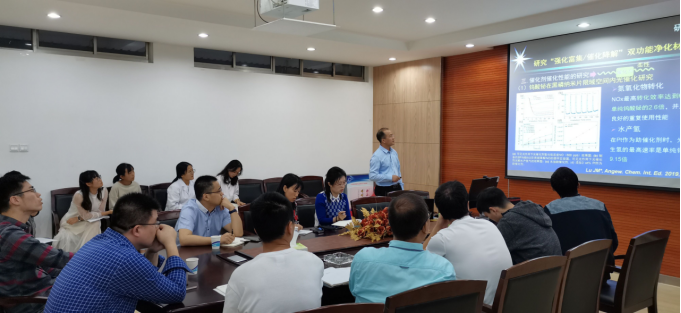 贺竞辉教授首先介绍了探究“强化富集/催化降解”双功能净化材料的研究思路,分别从酯基种类和协同能力富集驱动力、交联剂长度和交联密度调控富集性能、多种组合型催化剂催化性能等多个层次,就双功能净化材料对解决低浓度VOCs传质效率低、富集难、提高对反应物的吸附探测及催化氧化性能、增加催化活性位点等技术难题,详细介绍了课题组近年来取得的一系列研究成果。其次,贺竞辉教授从多组分电响应材料设计、材料中电子陷阱与VOCs相互作用、高质量薄膜研究方面,详细介绍了课题组在多组分VOCs高敏、快速、同时检测传感器件方面的研究成果。在此工作基础上,创新研究出一种“浓度识别/模块智能响应”深度净化技术,并介绍了三功能一体化智能净化装备的研发及其在处置尾气方面的多个应用案例。此外,贺竞辉教授进一步介绍了课题组在高浓度污染物处置及资源化方面取得的研究成果,并向参会师生展示了高效微纳吸附材料对油污染物的超快吸附性能。会后,参会师生积极互动,就多组分电响应材料的工作机制、一氧化碳的探测及催化氧化、低/高浓度VOCs处理技术方面的差异点及研究生招生等问题进行了提问,贺竞辉教授细致耐心地给予了详细解答,参会师生均受益匪浅。