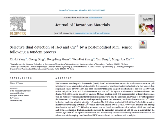 近日,江苏省新型环保重点实验室杨秀丽博士为第一作者、解明华博士为通讯作者、盐城工学院为第一单位的研究论文《Chiral UiO-MOFs based QCM sensors for enantioselective discrimination of hazardous biomolecule》(J. Hazard. Mater., 2021, 413, 125467)在环境科学与生态学领域一区TOP期刊《Journal of Hazardous Materials》上发表。该刊2020年影响因子为10.588,主要报道各类环境领域相关的材料、技术及方法的最新研究进展。