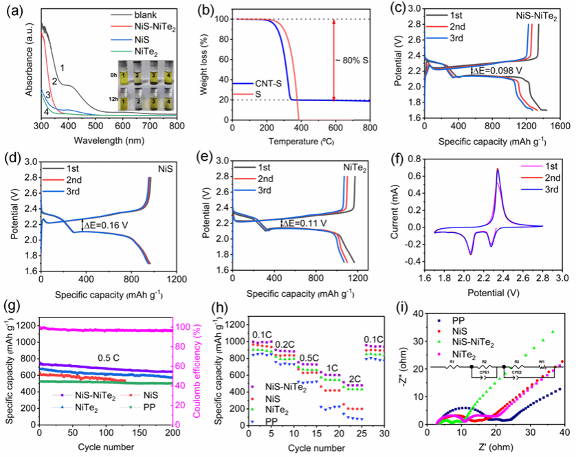 近日,我室孙林课题组和常州大学陈若愚教授团队以及南京大学金钟教授团队合作,通过溶剂热合成、硫化和碲化工艺的结合,成功地开发了一种高效的NiS-NiTe2异质结构,作为高性能Li-S电池传统PP隔膜的功能层。形成的NiS-NiTe2异质结构增强了对多硫化物的化学亲和力,加速了硫的吸附-催化转化。PP隔膜修饰NiS-NiTe2异质结材料后组装成锂硫电池,在0.5 C下循环200次后依然能保持有750 mAh g-1的高比容量,在2 C下可提供480 mAh g-1的高倍率性能。