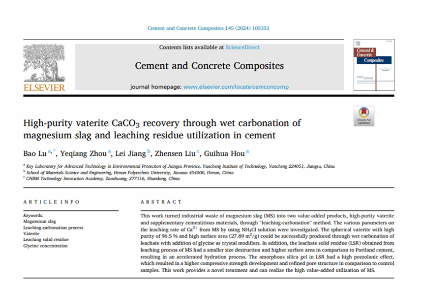 近日,以我室卢豹博士为第一作者和唯一通讯作者、盐城工学院为第一单位的研究论文“High-purity vaterite CaCO3 recovery through wet carbonation of magnesium slag and leaching residue utilization in cement” 在水泥混凝土领域Top期刊《Cement and Concrete Composites》(2024,145,105353)上发表。该期刊2024年影响因子为10.5,属于中科院1区期刊。