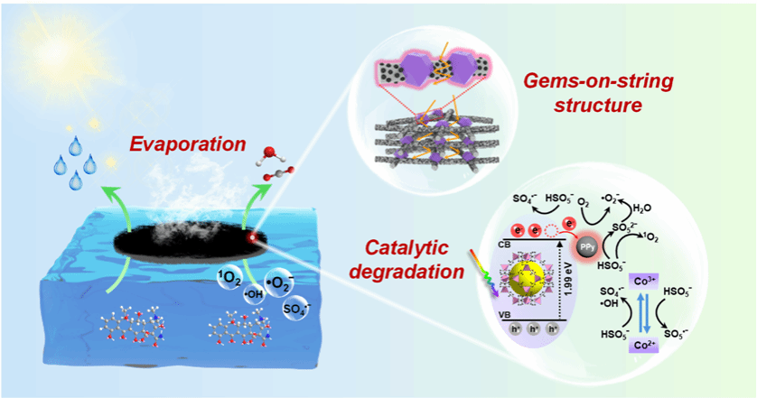 太阳能驱动界面蒸发(SDIE)是一种极具前景的淡水生产技术,但在处理含有机污染物的废水时,污染物可能随蒸发过程富集,不仅损害光热材料寿命,浓缩废水的排放还可能引发新的环境问题。为此,本研究构建了一种具有“串上宝石结构”的柔性双功能纳米纤维膜蒸发器,通过将PPy纳米颗粒均匀修饰在静电纺柔性SiO2纳米纤维上,并采用简便的热压法巧妙固定ZIF-67多面体,实现了清洁水生产和源水净化的同步进行。这种新颖独特的多级微纳结构,显著增强全光谱光吸收(96.3%)和光热转换效率。此外,膜的超亲水性和分级互连通道促进了水分传输并降低了蒸发焓。更重要的是,PPy的局部加热效应与ZIF-67的光催化性能及Co位点的协同作用,显著促进了PMS的活化。结果表明,这种双功能蒸发器在1个太阳光照下实现了2.29 kg m-2h-1的快速蒸发速率和93.2%的太阳能-水转化效率,同时保持了对土霉素92.5%的高效去除率。在处理复杂废水/海水时,该蒸发器每日可产出5.3 kg m-2的淡水。本研究不仅为制备柔性高性能光热催化膜提供了有效策略,也为淡水生产和污水净化提供了一个可持续的平台。该研究成果获得了国家自然科学基金(52203072, 22474122, 22171239, 21775136, 21771158),江苏省重点研发社会发展(BE2022772),江苏省“333工程”以及“青蓝工程”等项目的支持。